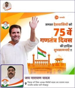 जय नारायण यादव पिछड़ा वर्ग जिलाध्यक्ष ,पीसीसी सदस्य भारतीय कांग्रेस पार्टी की तरफ से सभी क्षेत्र वासियों को गणतंत्र दिवस की हार्दिक शुभकामनाये